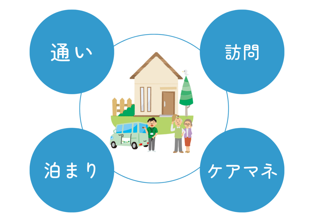 「訪問」「通い」「泊まり」「ケアマネ」4つの機能を1つの事業所で行うサービスです。利用者様の在宅生活全般を支える強い味方!